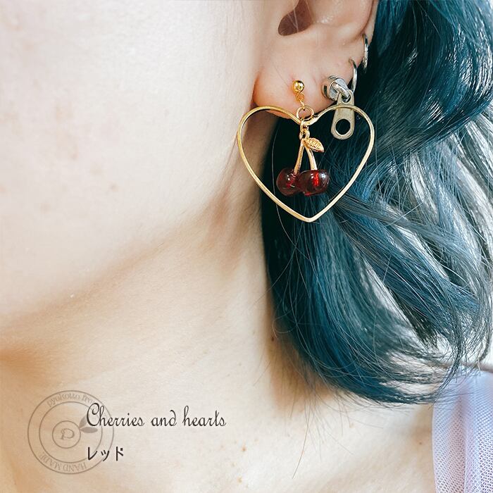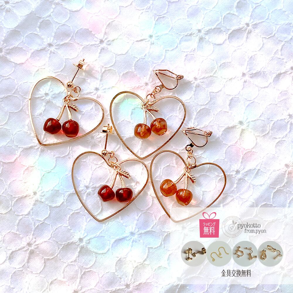 ハートの中でかわいいさくらんぼが揺れる耳飾りです♪