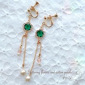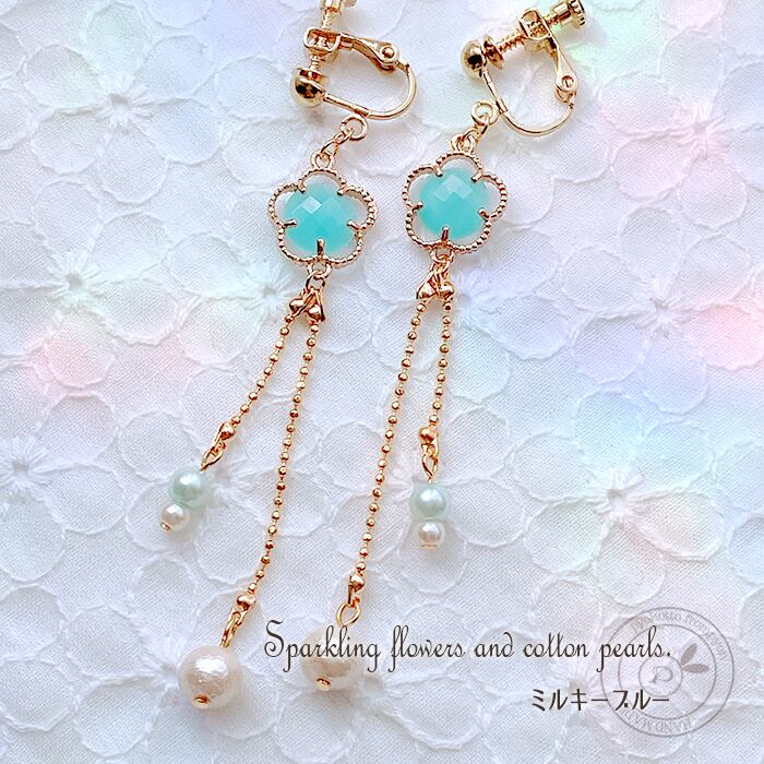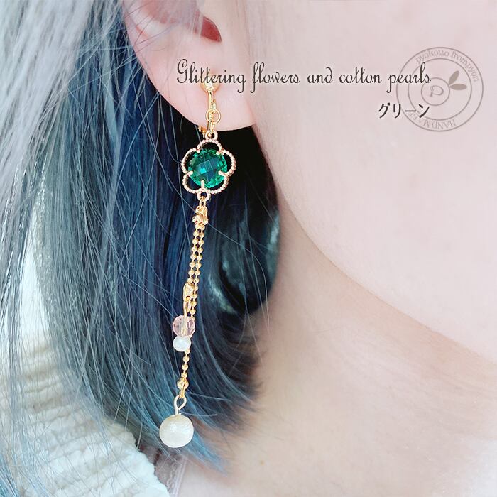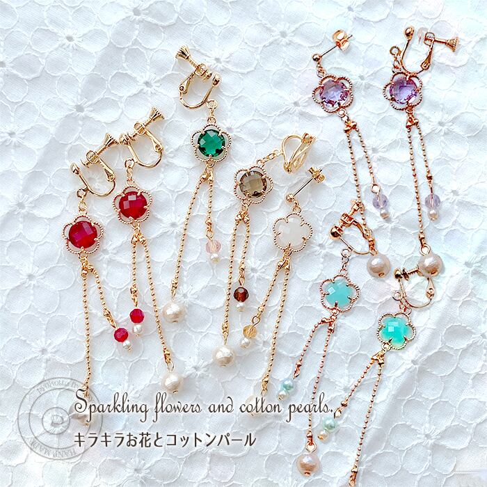 キラキラのお花にコットンパールを組み合わせた可愛らしいデザインです♪
