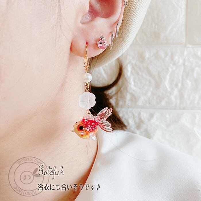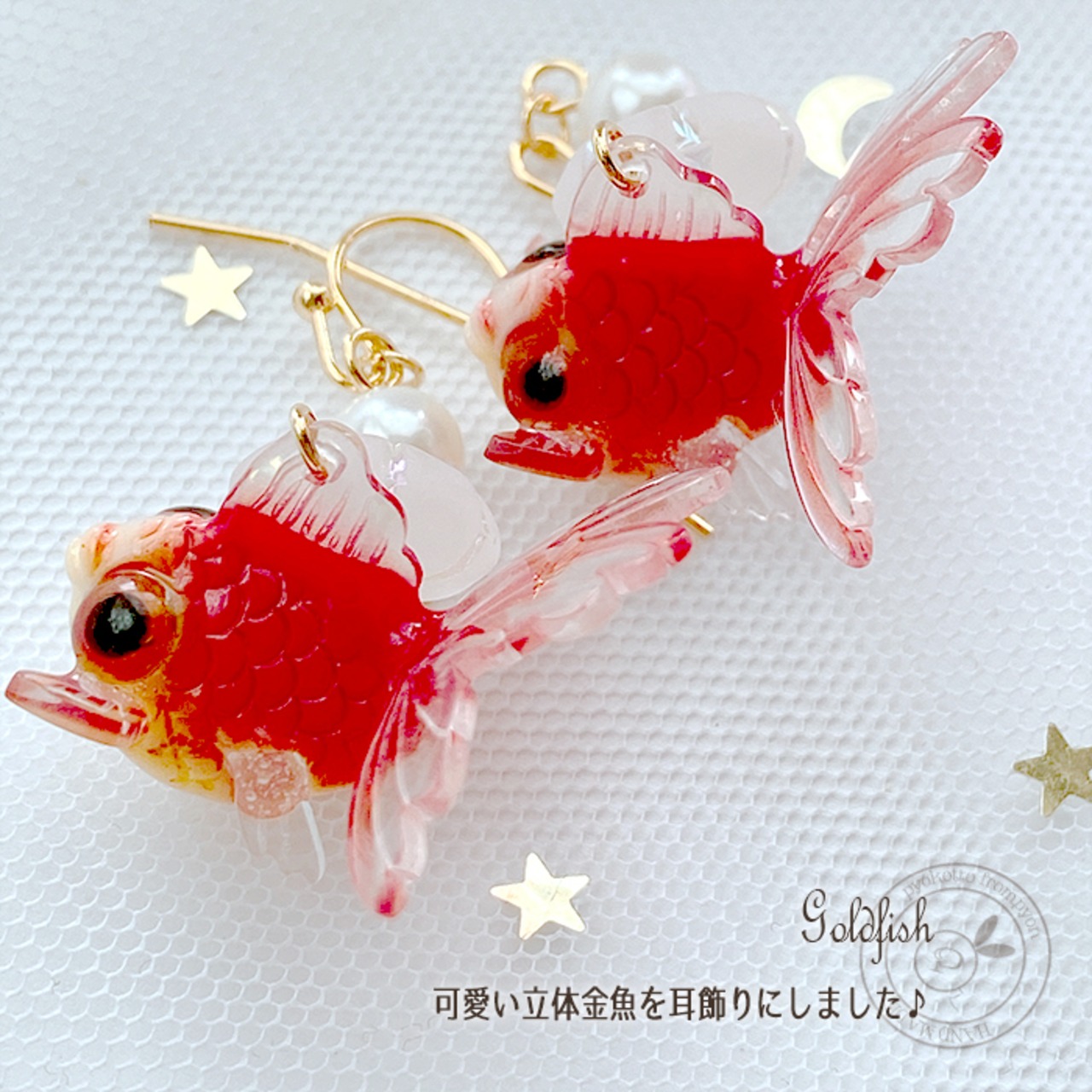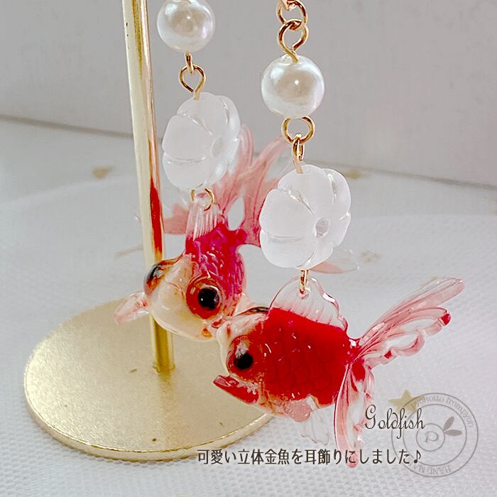立体的な金魚のモチーフがゆらゆら揺れる、とっても可愛い耳飾りです♪