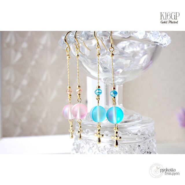 十字架と 、 ムーンストーン のように光る ガラス ビーズが付いています☆