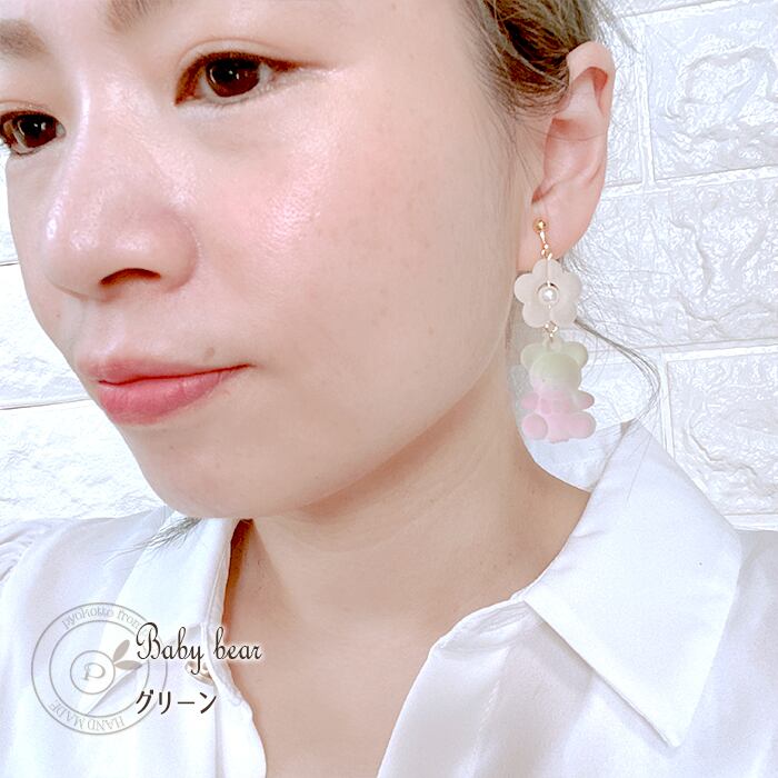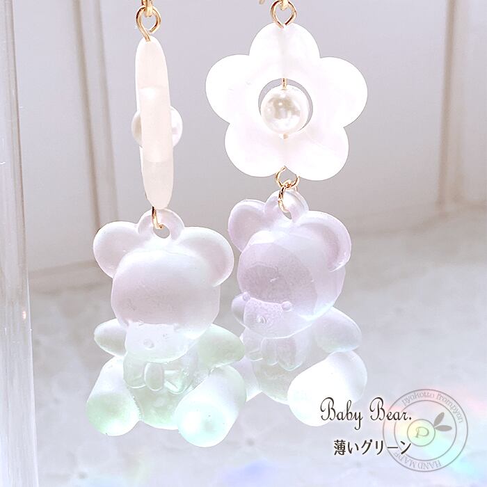 すりガラス風のくまさんとお花のピアスorイヤリングになります♪
