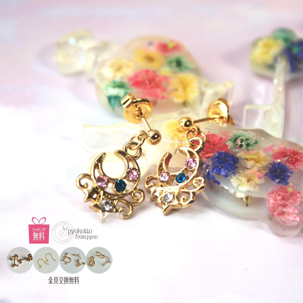 ゴールドの三日月にはピンクやブルー、クリアのストーンがキラキラするよ☆