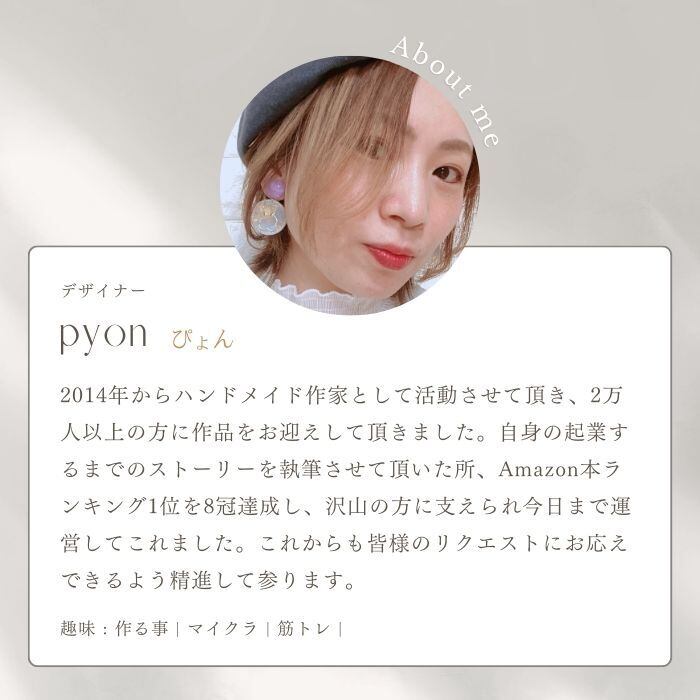 2014年にメルカリ・minne・Creemaにてハンドメイドアクセサリーpyokottoを開店し、現在延べ15000人以上のフォロワー様がいらっしゃいます☆