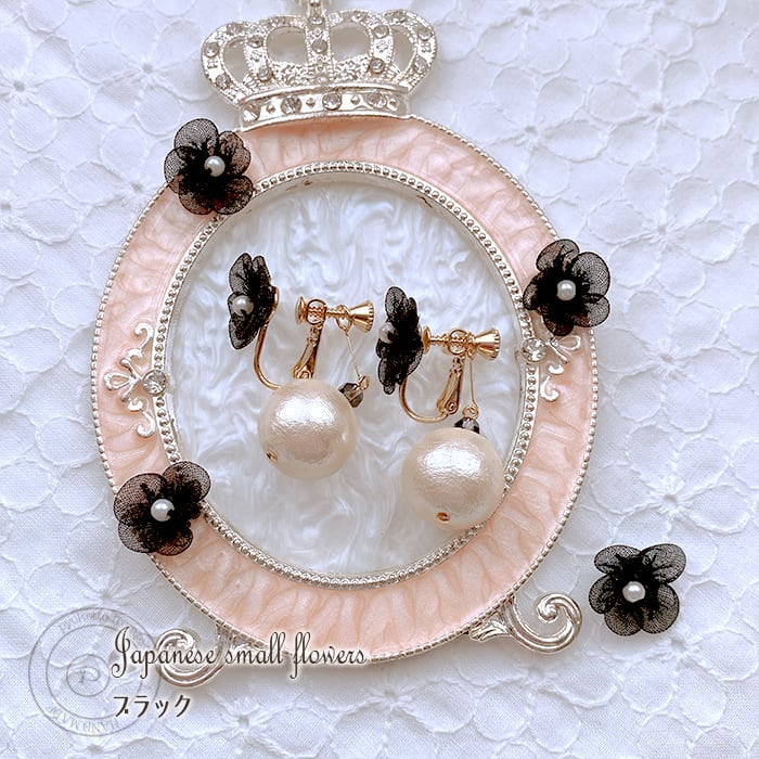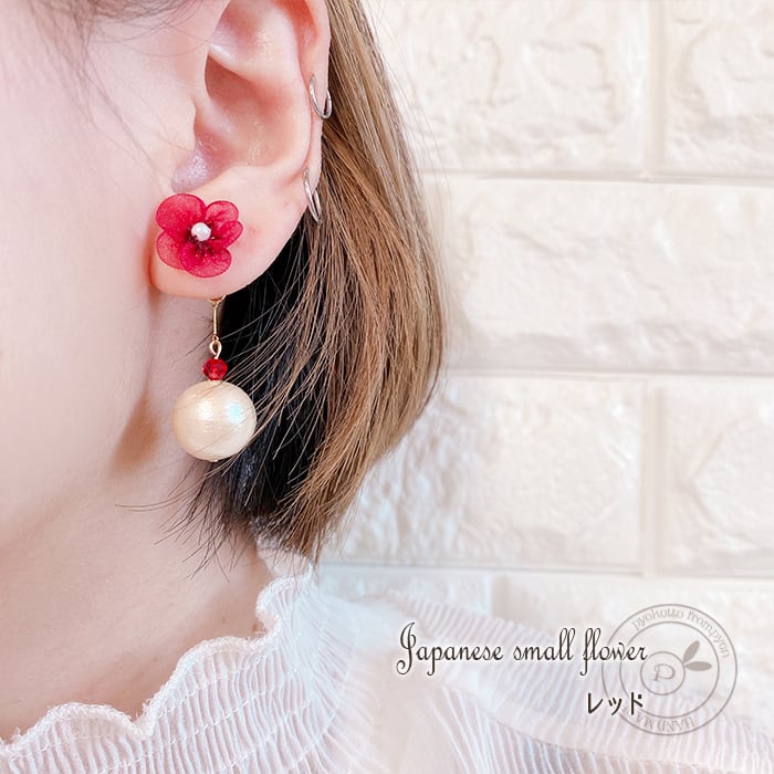 和風の雰囲気を漂わせる、花の形がかわいらしいコットンパールの大ぶりイヤリングです。